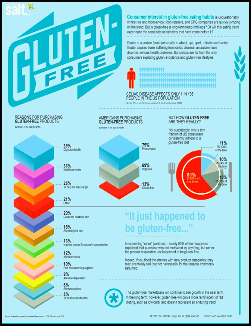 Existe otro grupo de personas que sin ser celíacas, presentan cierta intolerancia al gluten y están aquellas que deciden abandonarlo por propia elección, a raíz de que su artista o deportista favorito lo hizo, y le ha ido de maravilla, porque su amiga le dijo, o porque simplemente está de moda. Es interesante echarle un vistazo a los resultados de este estudio realizado en EEUU sobre las principales razones de compra de productos libres de gluten.