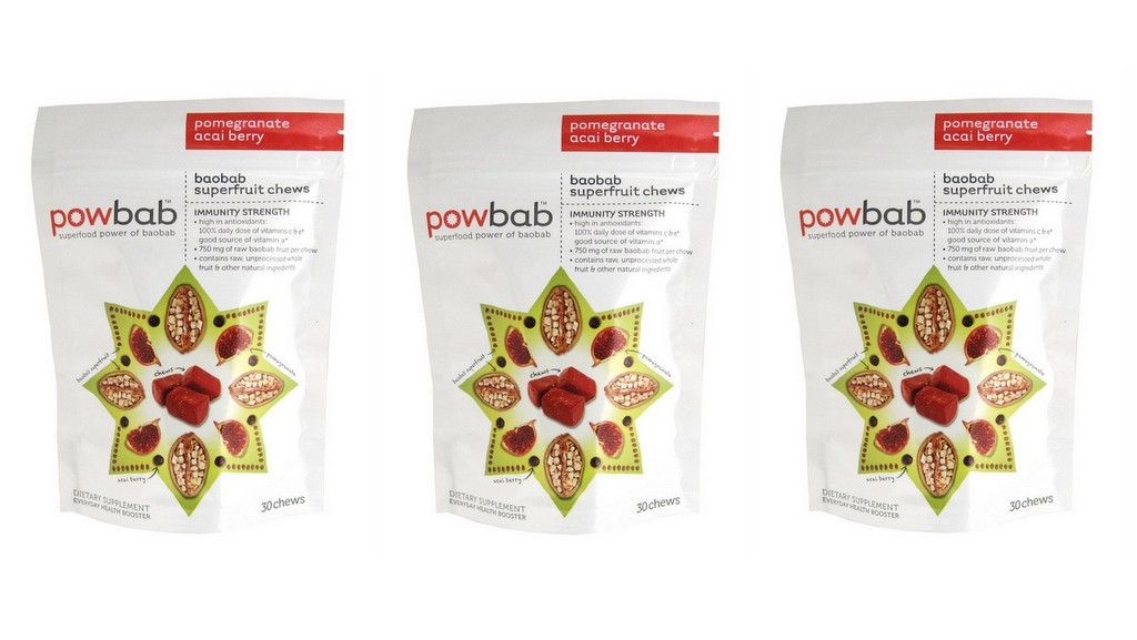Powbab creó este snack masticable a partir del fruto del bobab y de otras superfrutas como la granada y el açai. Una porción de powbab brinda el 100% de la dosis diaria de antioxidantes y de vitaminas C y E. Un producto 100 % orgánico apto para celiacos. Viene en bolsa de 750 grm con 309 porciones o en cómodos packs de 6 porciones.