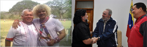 A la izquierda Samper con el Pibe Valderrama y a la derecha Maradona con Fidel Castro y el difunto Hugo Chavéz.