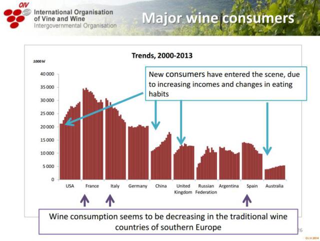 Por otra parte, la Organización Internacional de la Viña y el Vino, nos habla también de una disminución de consumo en algunos de los principales países productores (entre ellos España claro) y un aumento en otros debido a la aparición de nuevos consumidores, un aumento en sus ingresos y un cambio de hábitos alimenticios.