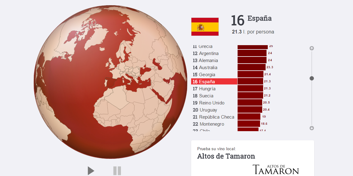 En cuanto al caso España, vemos que a pesar de ser uno de los líderes mundiales en superficie de viñedo y una potencia en exportación, no ocurre lo mismo con el consumo, o al menos no en la proporción que se podría esperar por ser país productor. La Organización Internacional de la Viña y el Vino sitúa en algo menos de 20 litros por persona/año, y con tendencia a la baja, muy evidente en los últimos veinte años.