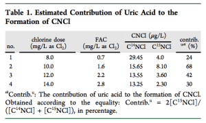 En un experimento, Casey Johnston en Ars Technica calculó cuánta orina tendría que tener una piscina olímpica para producir una cantidad de CNCl que ocasiona convulsiones, coma o que fuera letal. El resultado fue 2,500 microgramos por litro de agua. «Al final, necesitaríamos una piscina que tuviese una parte de cloro por cada dos de agua, y se necesitarían unas tres millones de personas orinando al mismo tiempo en una piscina olímpica, si es que antes no mueres aplastado por ellos», las que generarían una cantidad fatal de cloruro de cianógeno.