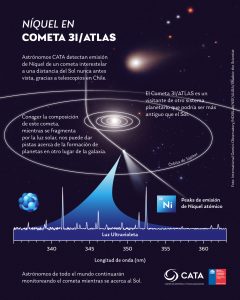 Lo llamativo en 3I/ATLAS es que ocurre todo lo contrario: el níquel domina sobre el hierro, con una razón Ni I/Fe I mucho mayor que la observada en cualquier otro cometa conocido. Esto sugiere que su composición química o el proceso que libera los metales es diferente al de los cuerpos formados en nuestro sistema solar, lo que refuerza su origen interestelar y su rareza.