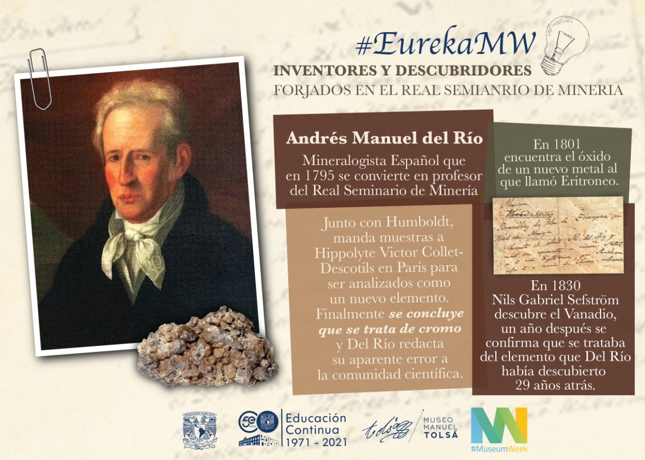 En 1801, el químico Andrés Manuel del Río, español afincado en México, descubrió el vanadio al analizar minerales en Zimapán. Lo llamó eritronio, por el color rojizo que mostraban sus sales al calentarse. Sin embargo, su hallazgo fue puesto en duda por Europa, cayendo en el olvido hasta que treinta años después, el sueco Nils Gabriel Sefström identificó el mismo elemento y lo bautizó vanadio, en honor a Vanadis, nombre de la diosa nórdica Freyja, símbolo de belleza y renovación.