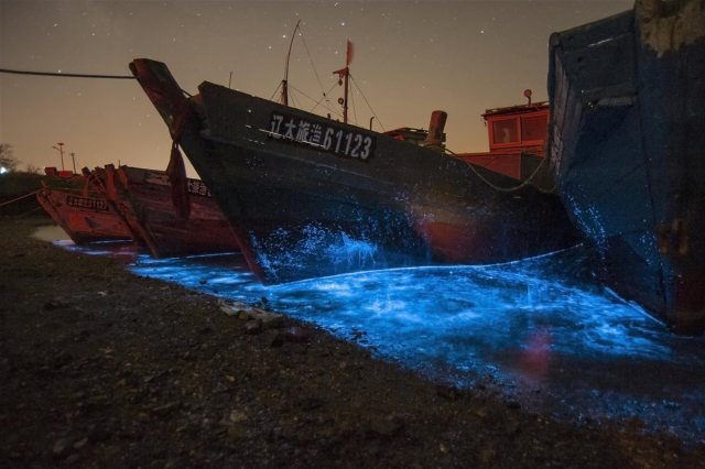 La bioluminiscencia alrededor de unas embarcaciones de madera en el pueblo pesquero de Xiaoheishi, en China. Vía National Geographic.