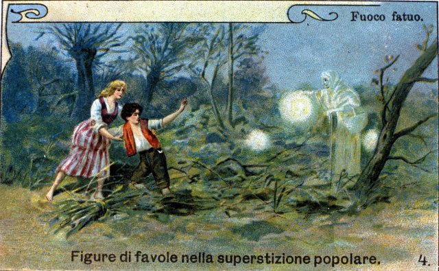 Un fuego fatuo, una luz difusa que se puede ver por la noche cerca de los pantanos y cementerios, sería «un espíritu astuto» según la tradición popular. Cromolitografía del siglo XIX. Artista desconocido.