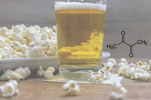 El diacetilo es el responsable del olor y sabor a mantequilla o palomitas de maíz, presente en la mantequilla (se usa como saborizante artificial) y en la cerveza.
