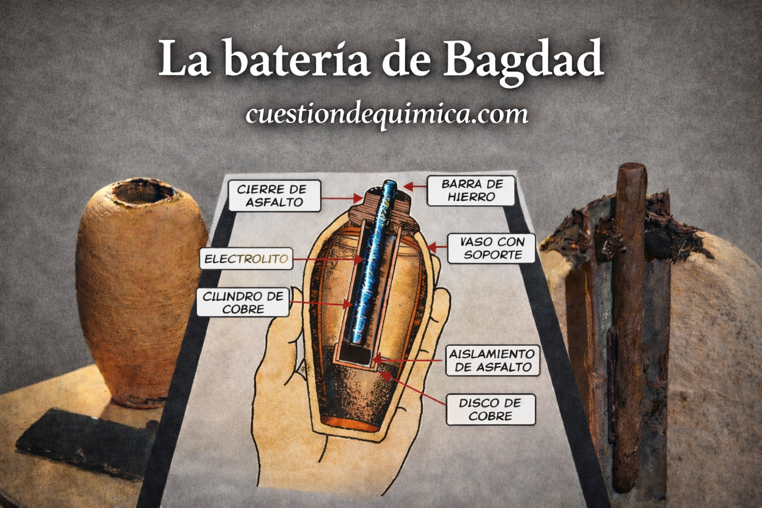 ¿Qué dice la electroquímica? El objeto consiste en un recipiente cerámico con un cilindro de cobre y una varilla de hierro, sellados con betún. Desde el punto de vista químico, en presencia de un electrolito ácido el sistema hierro-cobre puede comportarse como una celda galvánica primitiva, basada en reacciones redox sencillas, tal y como demostraron experimentos modernos llenándolo con electrolito ácido o zumo de uva, produciendo 1-2 V. Sin embargo, su aplicación histórica real sigue siendo un misterio: se especula que podría haberse usado para galvanoplastia (dorar plata) o para otros fines rituales, aunque no hay pruebas concluyentes.