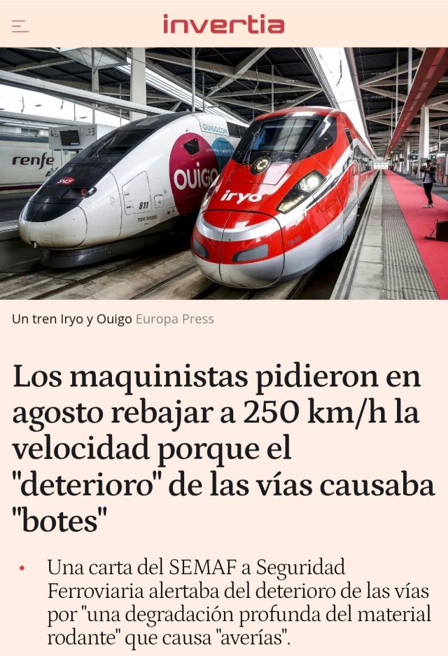 A primeros de Agosto de 2026, los maquinistas del sindicato SEMAF mandaban el aviso, a través de una carta al gestor de la infraestructura ferroviaria (Adif AV) y a la Agencia Estatal de Seguridad Ferroviaria (AESF), a Óscar Puente, ministro de Transportes. Aquí, se advertía que el deterioro de las vías estaba «produciendo una degradación profunda y acelerada en el material rodante, causando frecuentes averías».