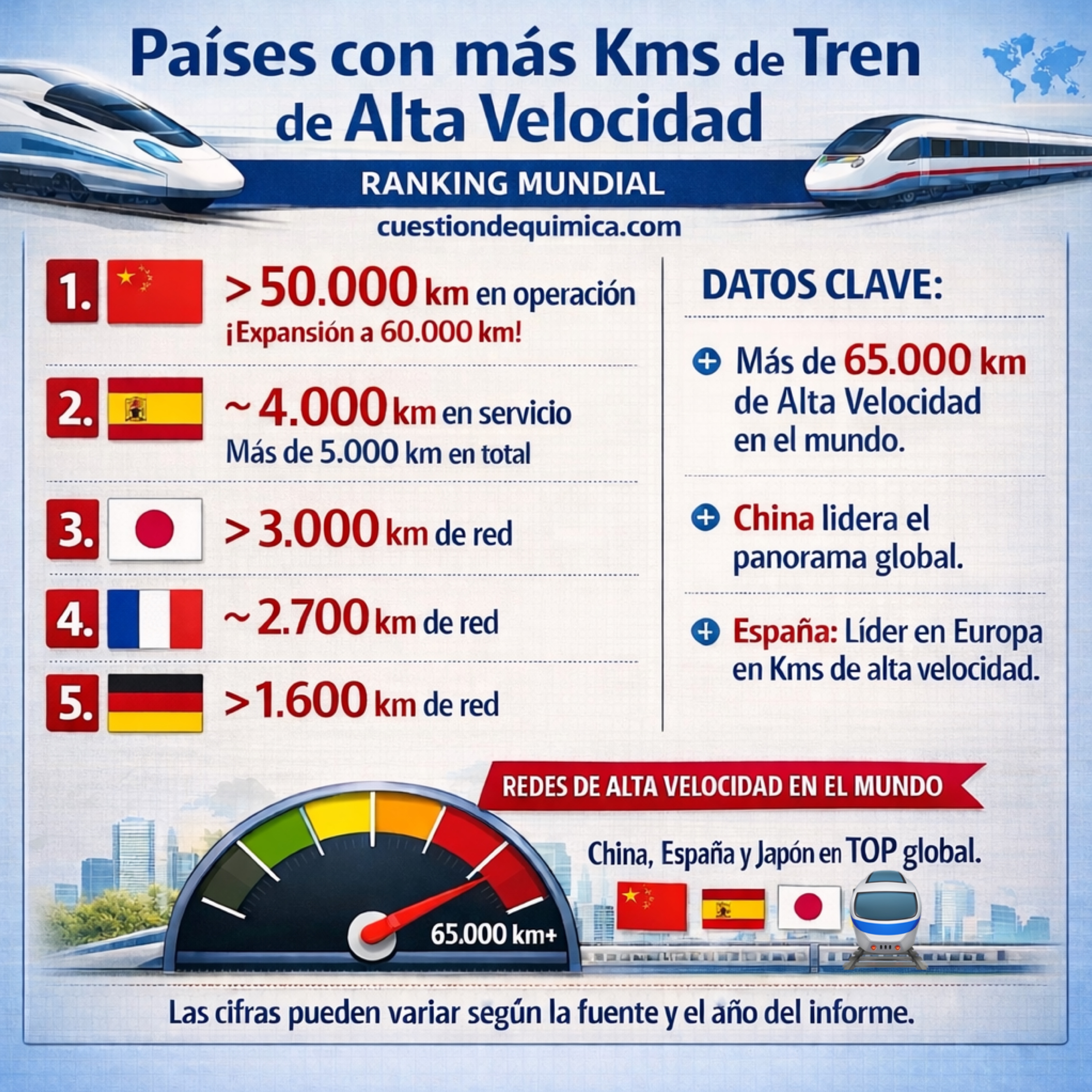 Ranking mundial de kms de tren de alta velocidad. Aunque las cifras varían ligeramente según la fuente, según los últimos datos disponibles para 2024/2025, China mantiene una ventaja abrumadora, mientras que España y Japón son los siguientes países con las redes más extensas de alta velocidad a principios de 2026.