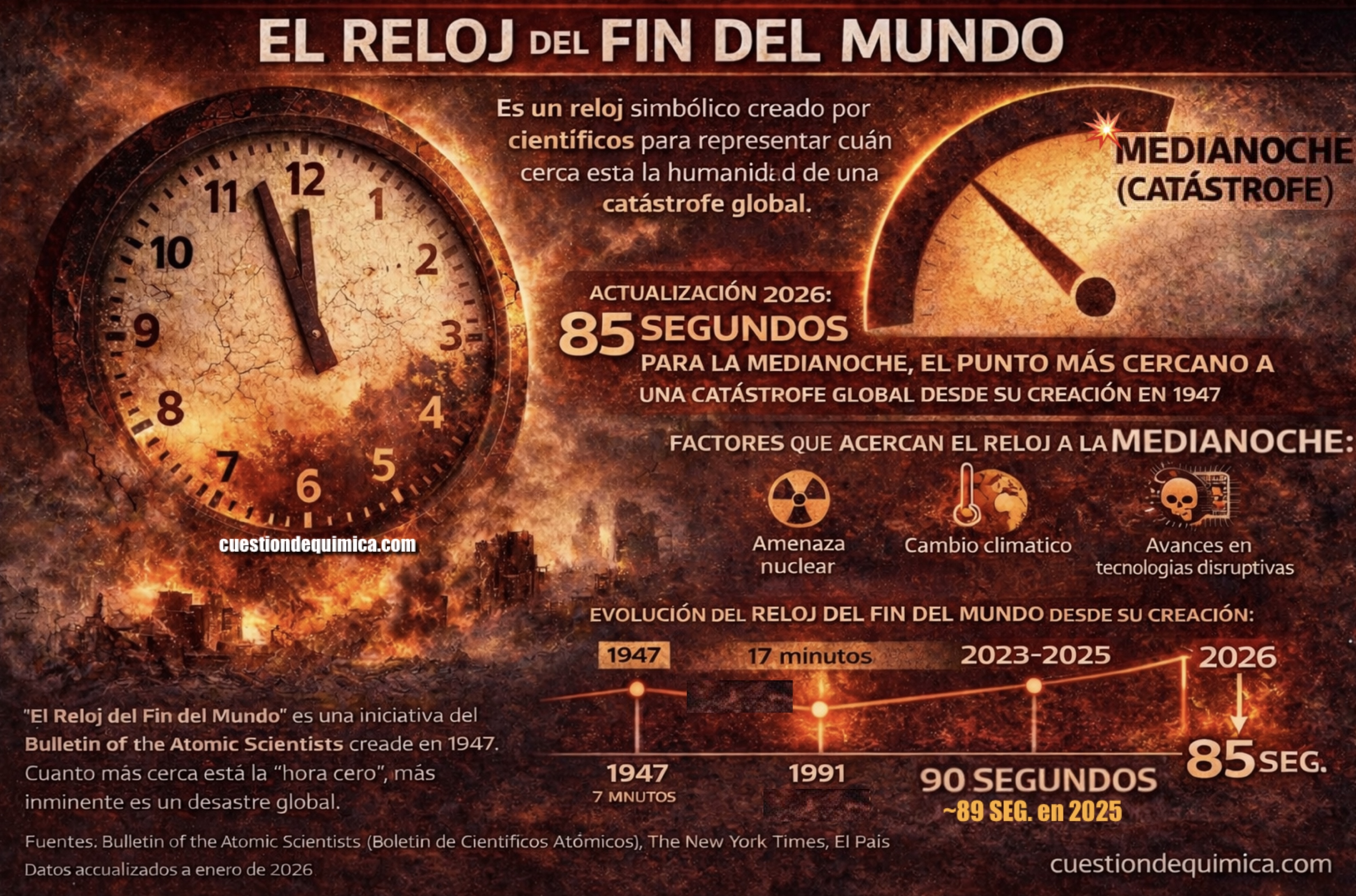 Infografía sobre el Doomsday Clock o Reloj del fin del mundo. Publicado enero 30, 2026 en 4000 × 2644 en Reloj del fin del mundo, vórtice polar y química: entre el riesgo real y el ruido. « Anterior Infografía sobre el Doomsday Clock o Reloj del fin del mundo. Fuente: Bulletin of the Atomic Scientists y The New York Times.