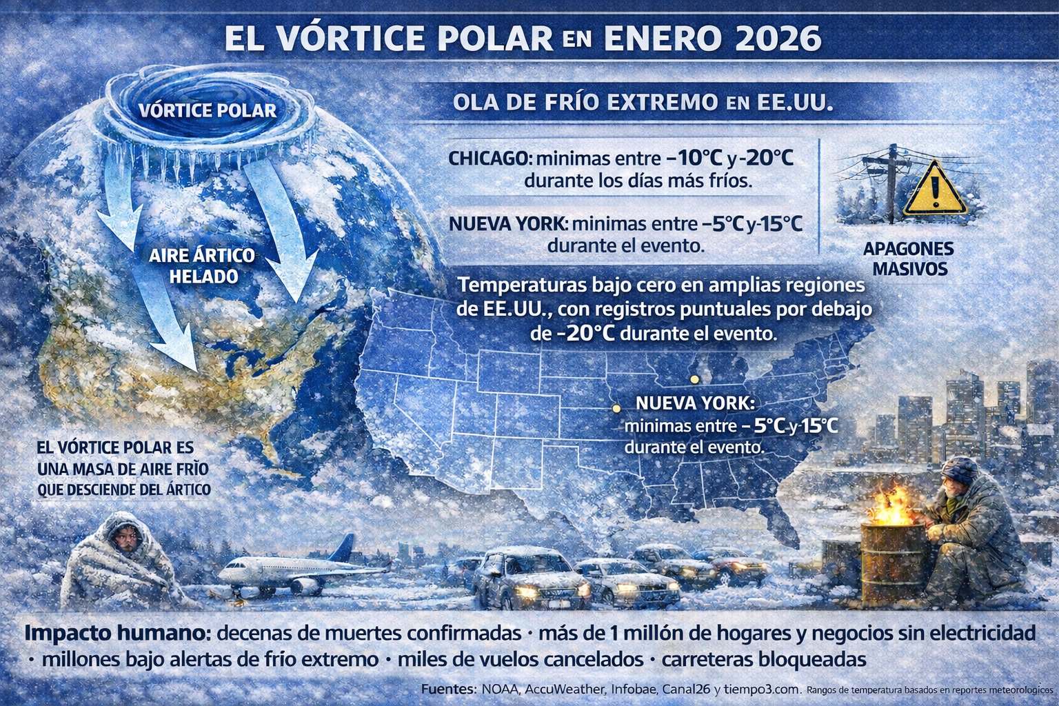 Vórtice polar EEUU infografía cuestión de química Publicado enero 29, 2026 en 1536 × 1024 en Reloj del fin del mundo, vórtice polar y química: entre el riesgo real y el ruido. « Anterior Siguiente » Rangos de temperaturas e impactos basados en reportes meteorológicos de Enero de 2026 Fuente: NOAA, AccuWeather, Telemundo, Infobae, Canal26 y tiempo3.com.