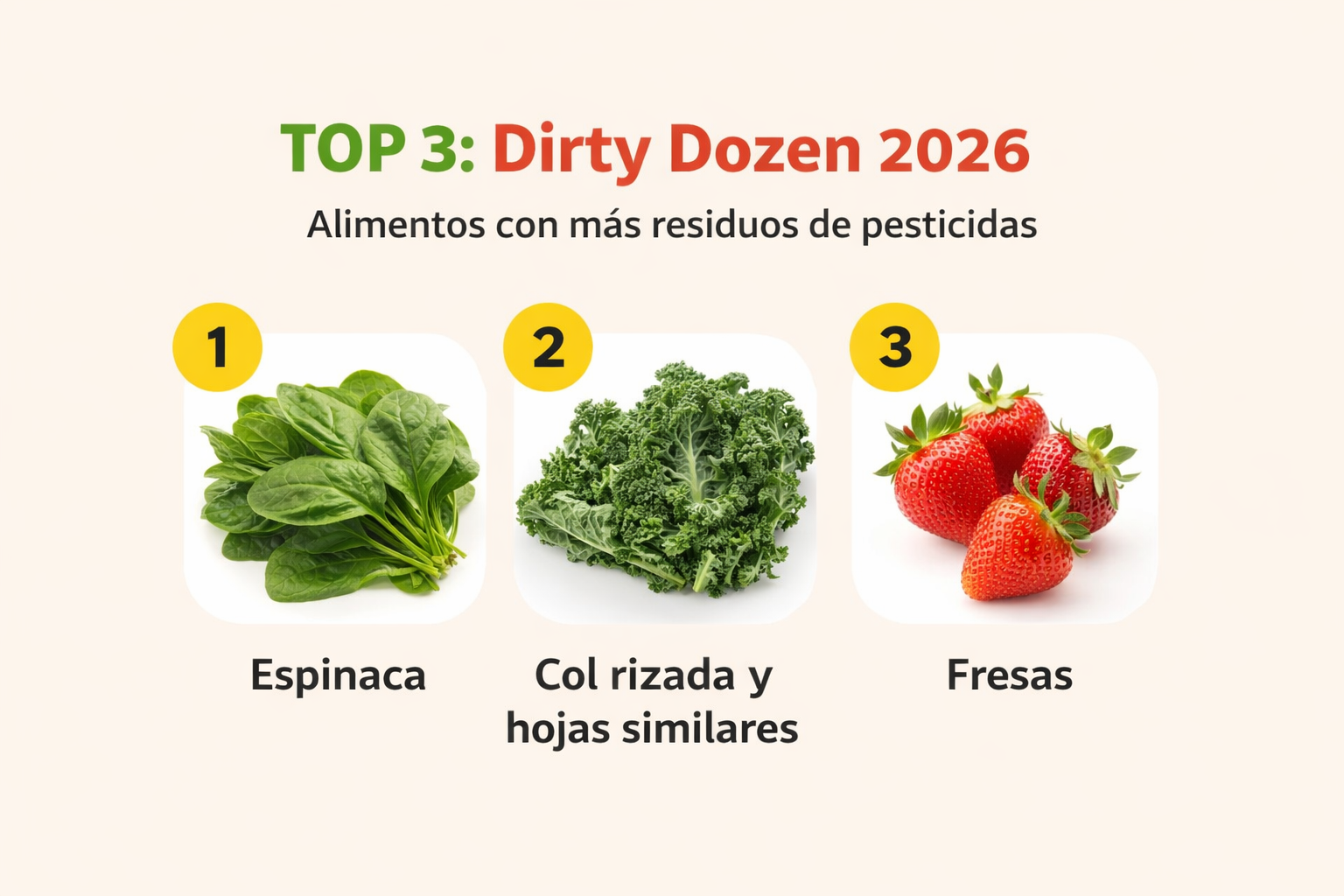top 3 disrty dozen Publicado abril 14, 2026 en 1536 × 1024 en Los alimentos con más pesticidas en 2026: lo que hay detrás de la lista. Siguiente » Top 3 de alimentos con mayor presencia de residuos de pesticidas según el análisis del EWG: espinaca, col rizada y fresas